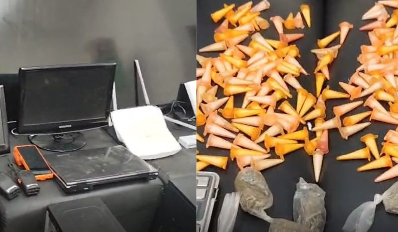 Entre os itens apreendidos, encontram-se: 18 câmeras de segurança, 4 roteadores, 1 switch, 3 computadores, 2 monitores, 3 televisores, 3 parafusadeiras, 1 martelete, 1 lixadeira, 1 soprador térmico, 1 serra circular, 1 macaco de veículo, 1 máquina de cartão, 6 aparelhos celulares, 174 pinos de cocaína, 12 porções de maconha, 1 balança de precisão e 2 embalagens contendo insumos para misturar cocaína.