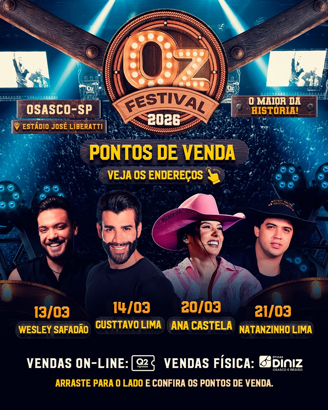 Com uma edição ampliada, o OZ Festival 2026 promete forte impacto econômico e um público recorde. Datas de shows já confirmadas incluem apresentações de Wesley Safadão, Gusttavo Lima, Ana Castela e Natanzinho Lima, nos dias 13, 14, 20 e 21 de março, respectivamente. A organização informa que a ordem e horários das apresentações serão divulgados nas redes oficiais do evento.