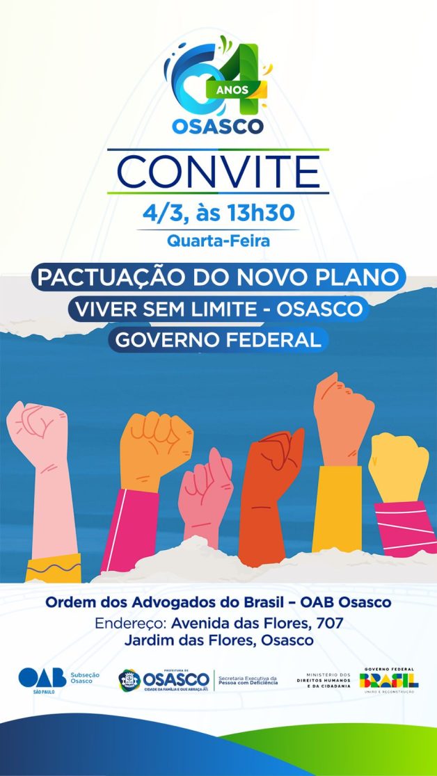 Nesta quarta-feira (4/3), às 13h30, a cidade de Osasco dará um importante passo na consolidação das políticas públicas inclusivas ao firmar a adesão ao Novo Plano Viver Sem Limite, em um evento na sede da Ordem dos Advogados do Brasil (OAB). Essa iniciativa é coordenada pelo Ministério dos Direitos Humanos e da Cidadania, por meio da Secretaria Nacional dos Direitos da Pessoa com Deficiência.