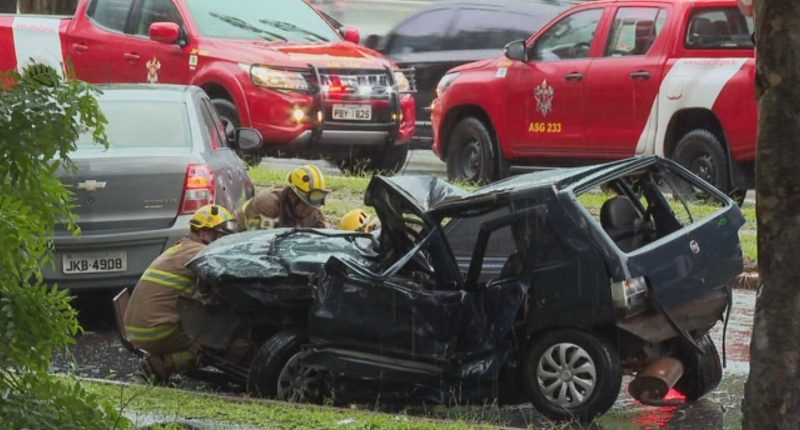 Acidente na Asa Sul, Brasília: Carro fica destruído e motoristas são socorridos